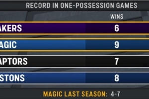 湖人主場迎戰(zhàn)魔術(shù),轉(zhuǎn)播方給出一項統(tǒng)計,本賽季一回合定勝負(fù)的比賽,湖人6勝0負(fù)排名第一,魔術(shù)9勝3負(fù)排名第二。
