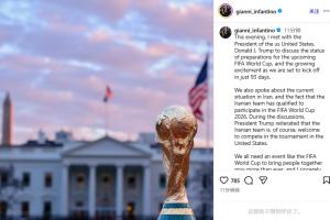 因凡蒂諾寫道:“今晚,我會見了美國總統特朗普,討論了即將舉行的FIFA世界杯的籌備情況,并表達了我們對93天后世界杯即將開賽的激動心情。