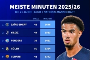 體育資訊3月13日訊 德轉統計本賽季五大聯賽U21球員出場時間榜,巴黎球員埃梅里3646分鐘第一,伊爾迪茲第二,亞馬爾第七。