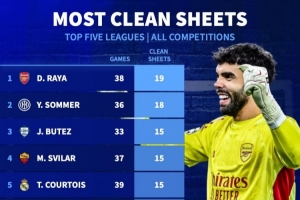 數(shù)據(jù)統(tǒng)計顯示,本賽季歐洲五大聯(lián)賽門將中,拉亞各項賽事出戰(zhàn)38場比賽,有19場零封,零封場次最多。