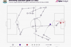 數據統計顯示,戈登的這粒進球,紐卡斯爾11名球員中有10人參與其中,沃爾特馬德是在此期間唯一沒有觸球的球員。
