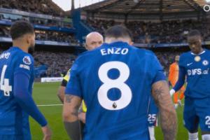英超第30輪,切爾西vs紐卡,切爾西球員賽前圍圈把主裁保羅·蒂爾尼圍住,帕爾默抱裁判+盯著看。