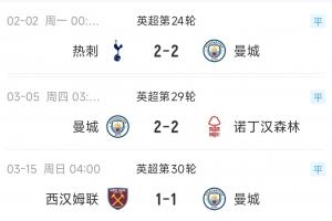 最近3次掉鏈子,曼城剛好是送給保級隊每隊1分,他們2-2戰(zhàn)平第16熱刺,2-2戰(zhàn)平第17森林,1-1戰(zhàn)平第18西漢姆。